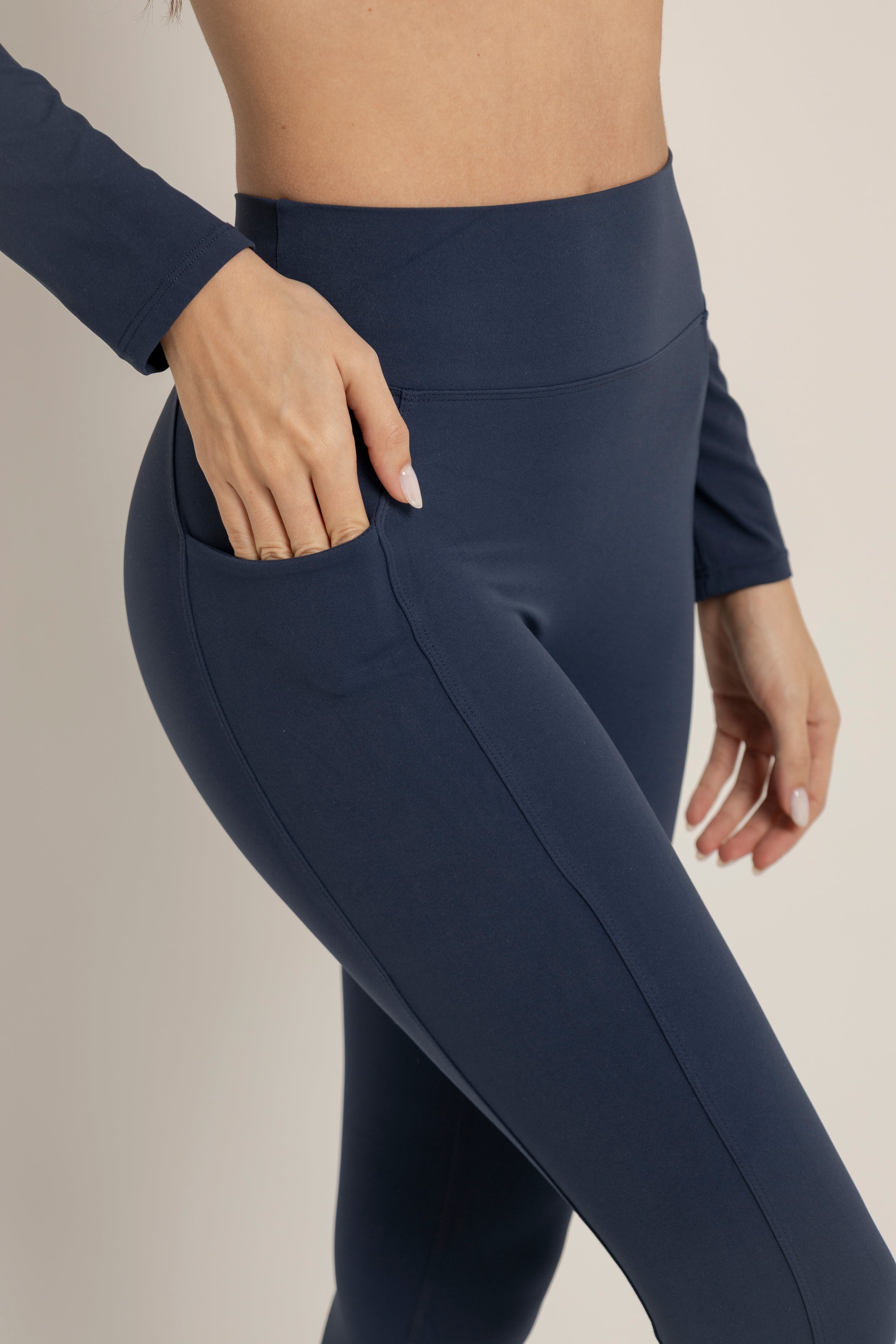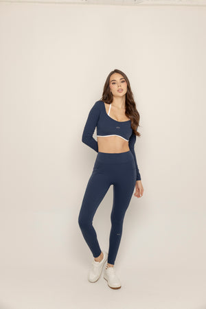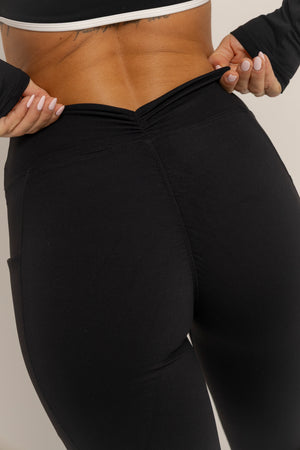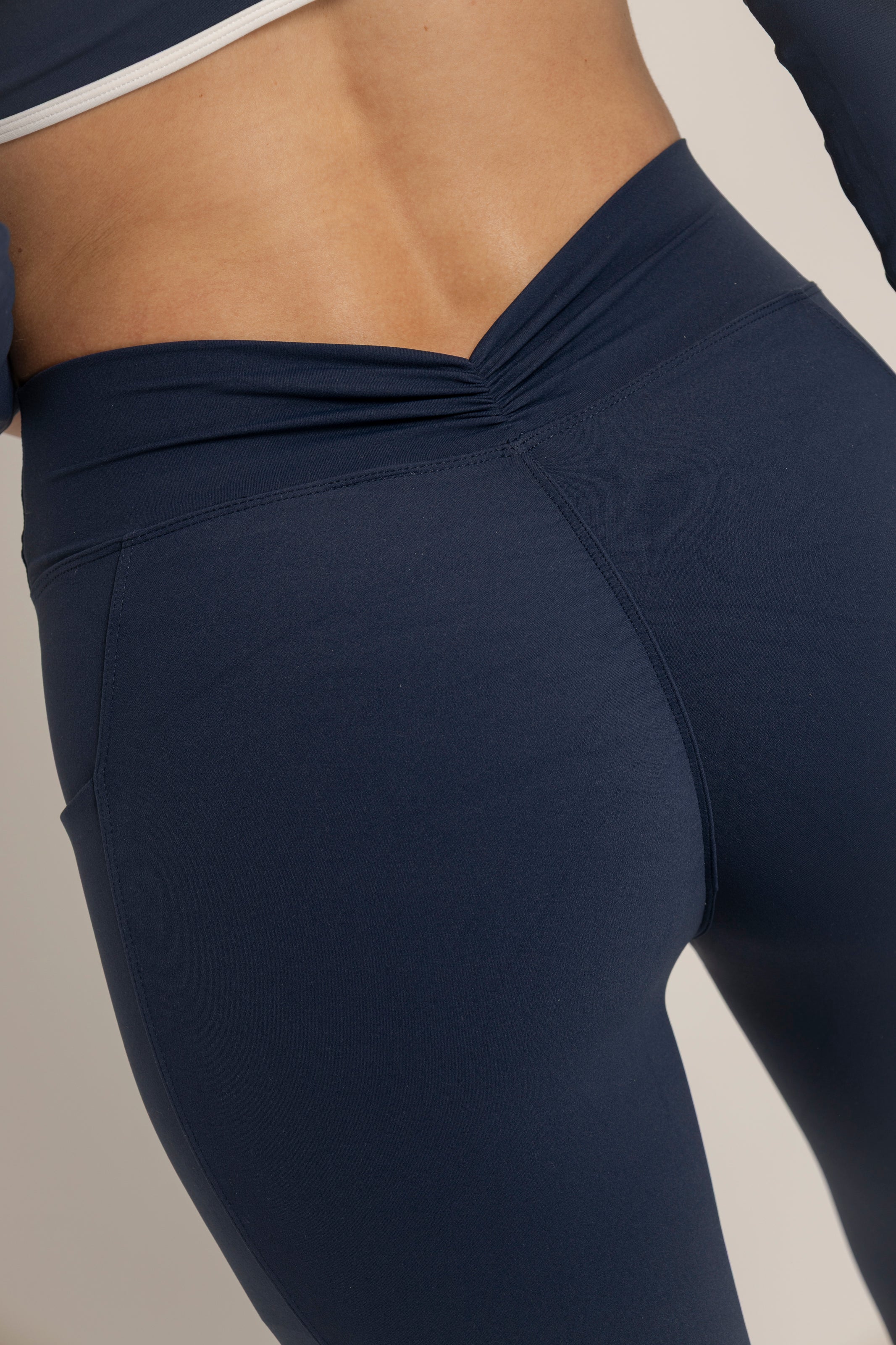 Legging de tiro alto diseñado para esculpir y realzar la silueta. Su corte en V en la parte trasera y detalle fruncido crean un efecto lifting natural, mientras que el ajuste compresivo moldea sin sacrificar comodidad. Incluye bolsillos laterales funcionales que lo hacen perfecto para entrenar o usar en el día a día.